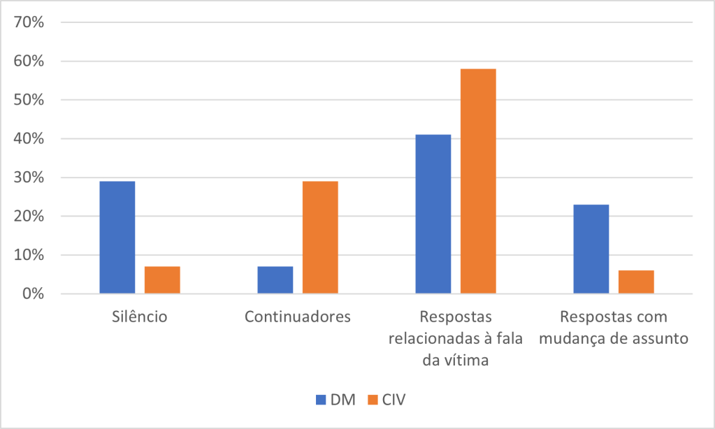 Como você pode ver, nossos dois pares de reações estão, em alguma medida, espelhados. No grupo das reações em que a profissional se recusa a tomar a palavra, há mais silêncios na DM do que no CIV – e, inversamente, mais continuadores no CIV do que na DM. No grupo das reações em que a profissional toma a palavra para si, há mais respostas relacionadas à fala da vítima no CIV do que na DM – e, inversamente, mais respostas com mudança de assunto na DM do que no CIV.